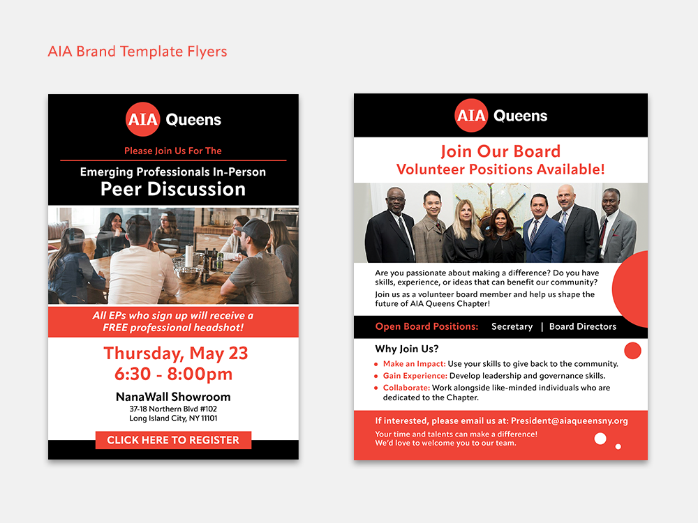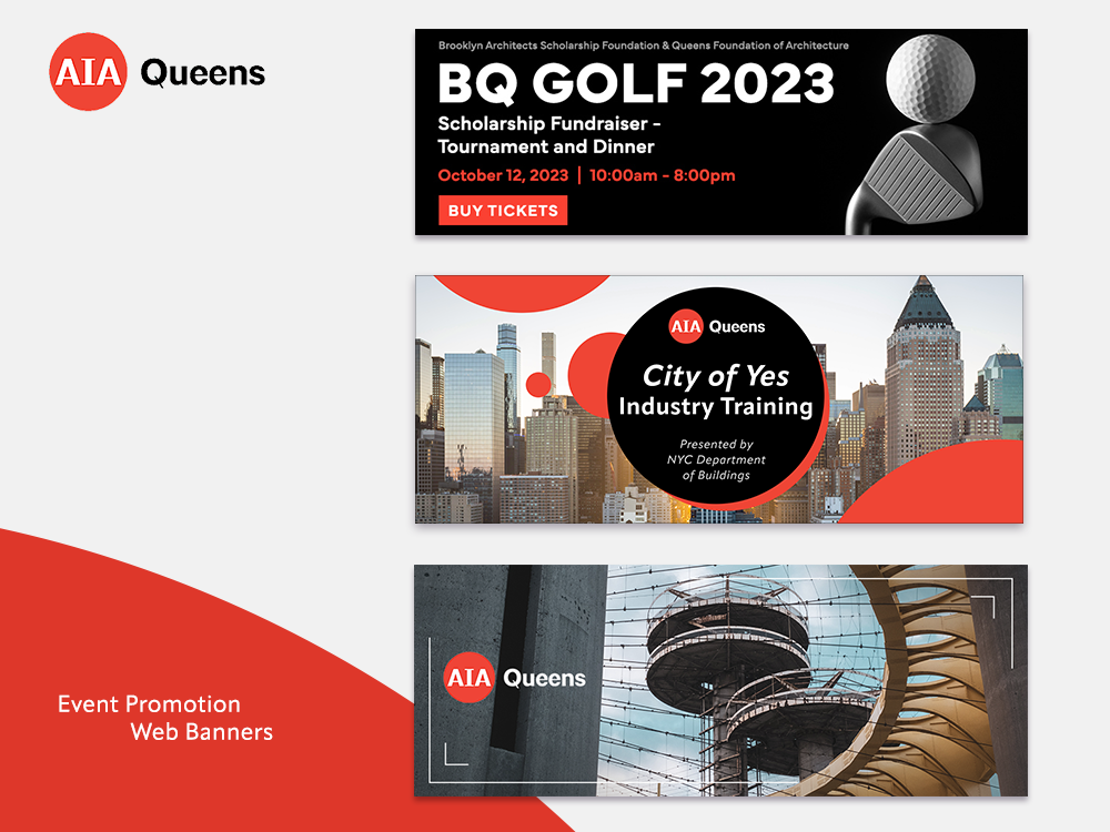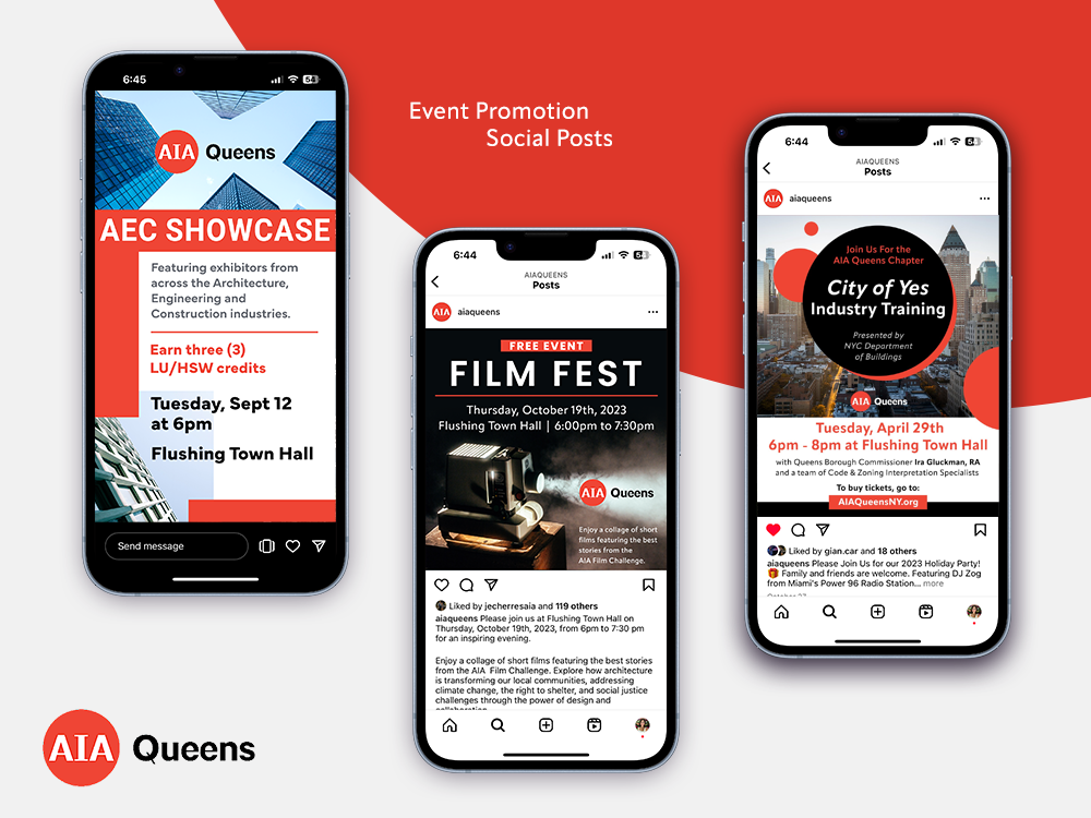 Designs for branded social graphics, email blasts and website assets. AIA Queens is a chapter of the American Institute of Architects. The goal of these campaigns is to communicate information about chapter events to members, enhance message clarity, exhibit professionalism and elevate the brand, while also remaining aligned with the overall AIA brand identity.